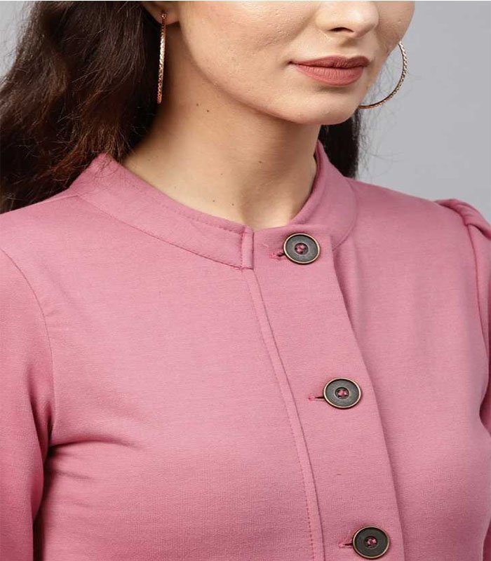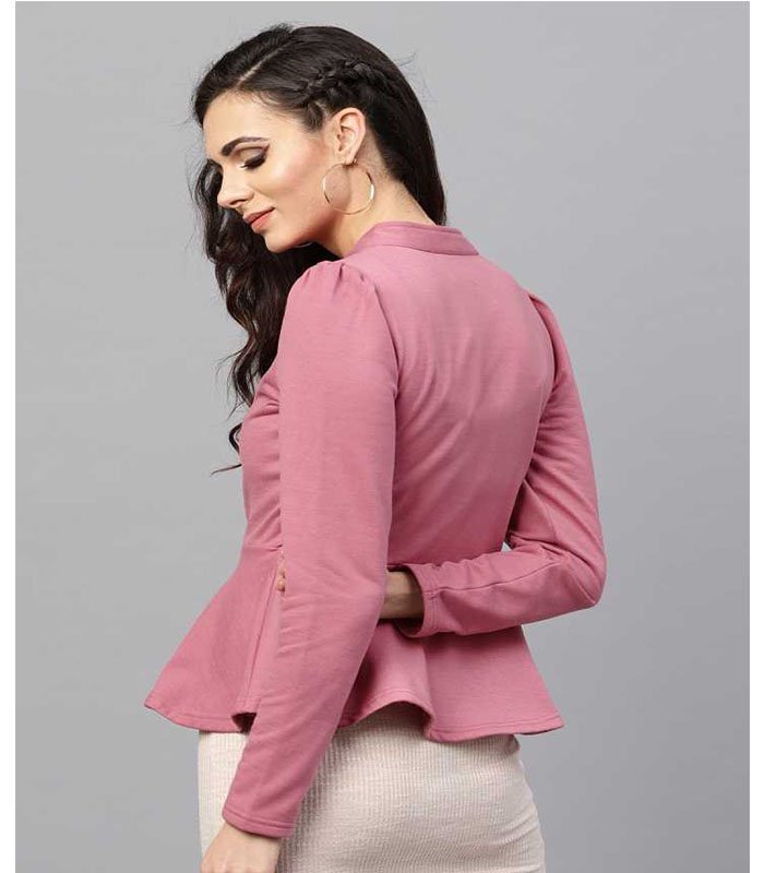 Pink Fleece Peplum Jacket with a Mandarin Collar, in Fleece fabric, Unlined, Full Sleeves, Regular , Fit & Flare, Button Closure, Flared Hemline and features Peplum Pattern